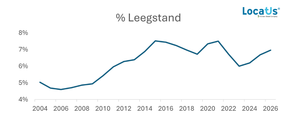 De leegstand is vorig jaar echter ondanks dit weer gestegen, van 6,7% begin vorig jaar naar 7,0% nu, daarmee is de stijging in 2025 wel minder dan in 2024 toen de leegstand steeg van 6,2% naar 6,7%.